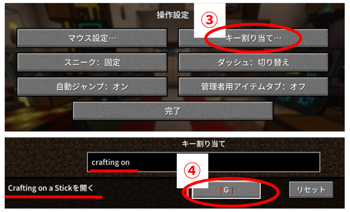 - プレイ画面に戻り、設定したキーを押すとクラフト画面が表示されるので、通常の作業台と同様にアイテムを配置してクラフトします。